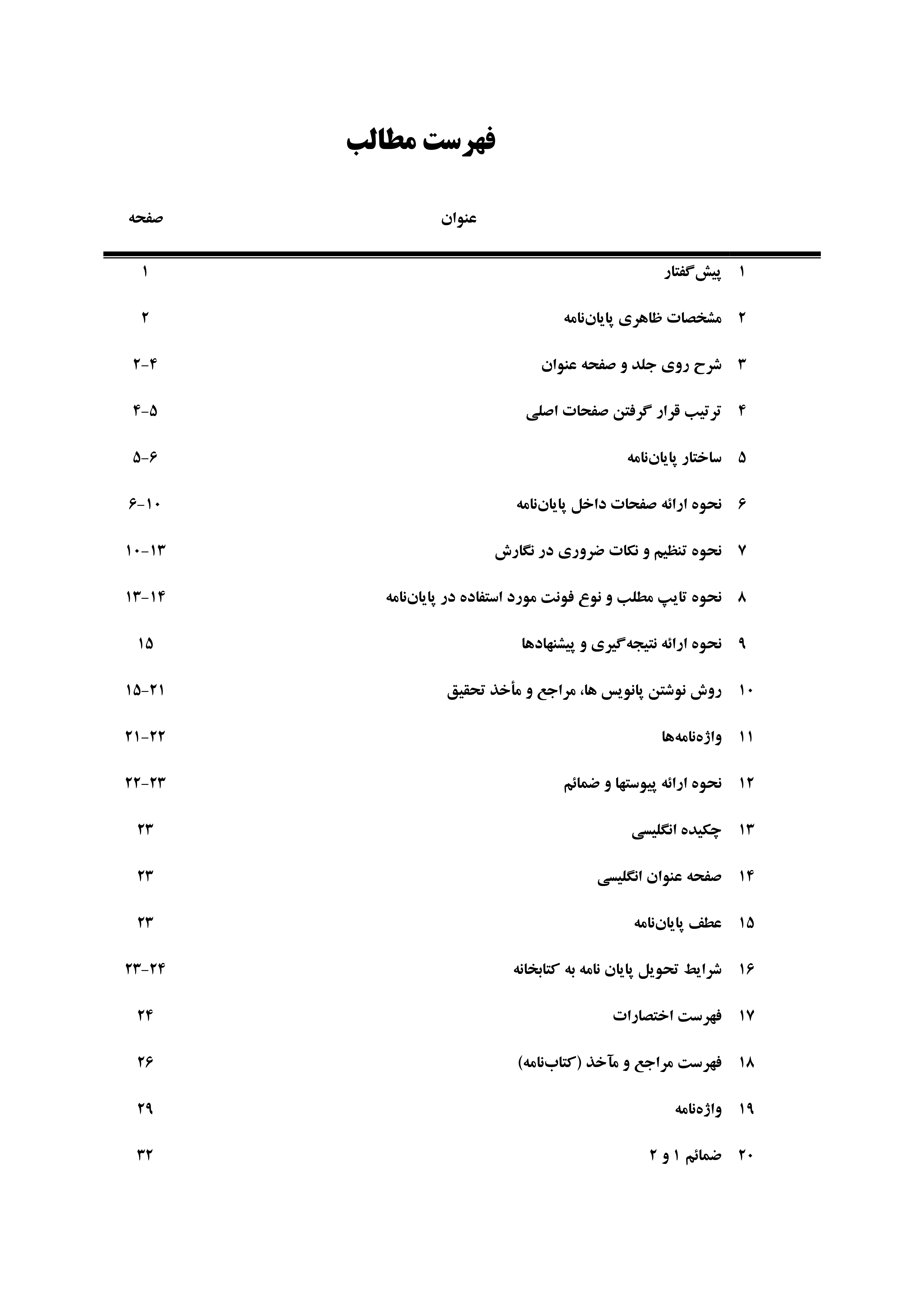 فهرست مطالب باید مطابق تصویر زیر دارای ردیف، عنوان و شماره صفحه باشد.